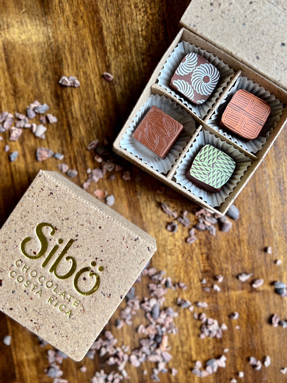 Nuestras cajas de bombones artesanales están hechas reutilizando cáscaras de cacao y transformándolas en papel. No utilizamos bandejas ni insertos de plástico. Cada caja contiene una selección de trufas de chocolate de temporada y caramelos clásicos, inspirados en recetas encontradas en documentos históricos y en tradiciones indígenas de Costa Rica.