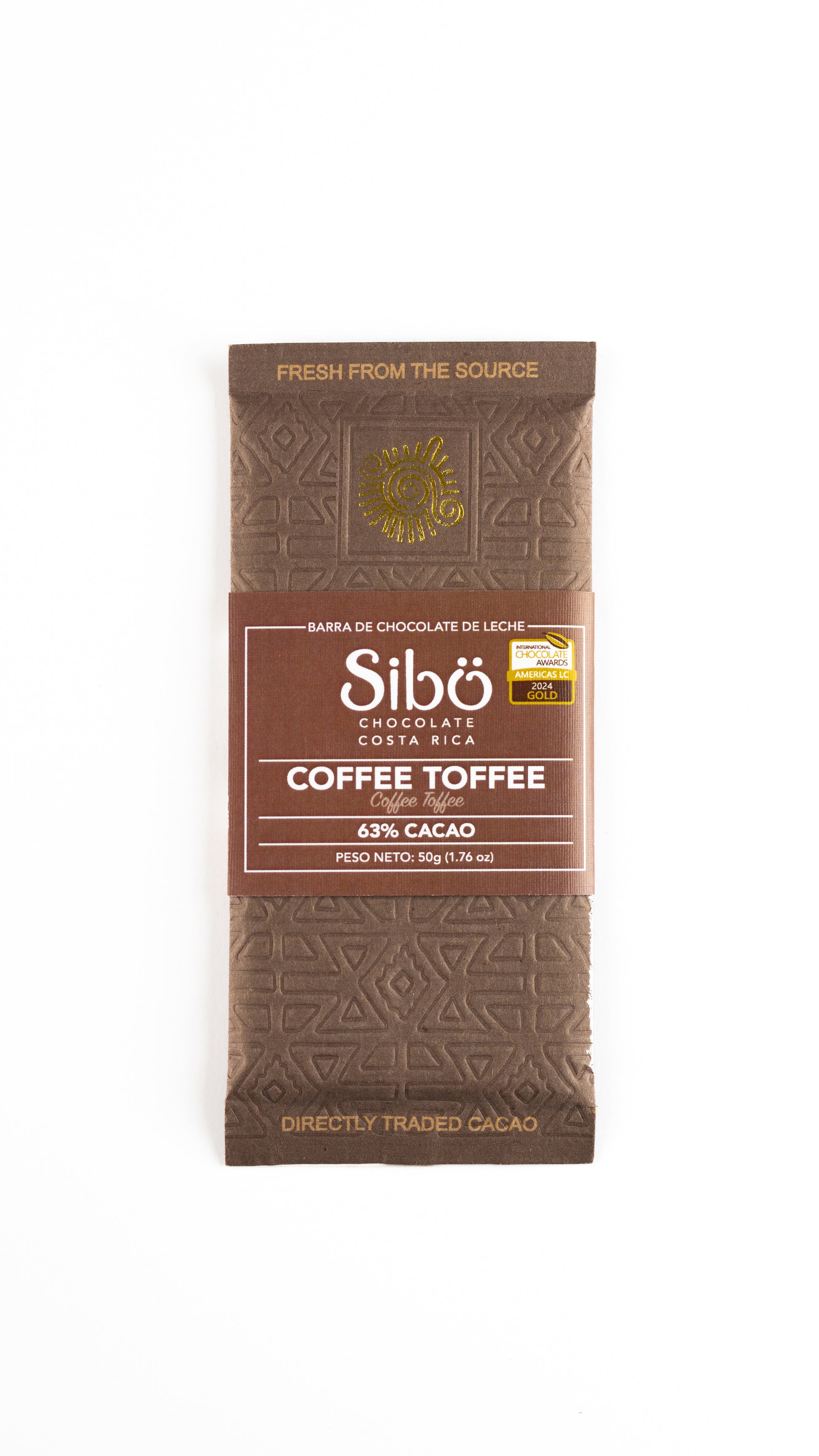 Usamos café arábica gourmet de la región de Naranjo, Costa Rica, para crear un crujiente toffee de azúcar caramelizado con vainilla natural y una pizca de sal marina, que luego incorporamos en nuestro chocolate con leche oscuro 63% cacao.