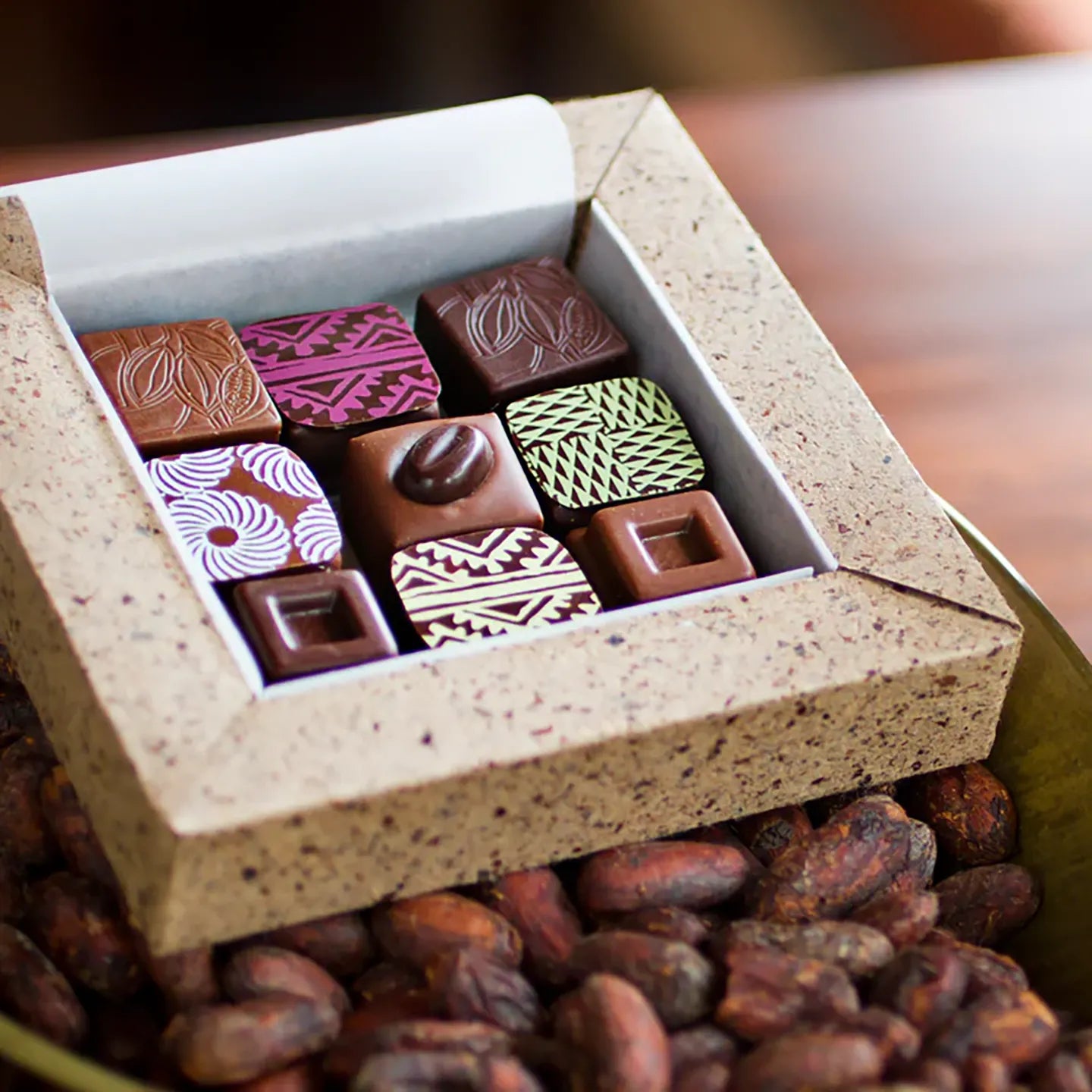 Products that are overpackaged or use excessive use of plastic is usually a bad sign. Sibö Chocolate wraps its bars in recycled paper pouches that are lined with a thin layer of food wrap to seal in freshness. And instead of plastic, Sibö prefers compostable cellulose bags to display its chocolate coated nuts and fruit. Finally, Sibö Chocolate works closely with a natural paper producer to fashion handmade bonbon boxes using husks from the cacao bean that are usually thrown away as a byproduct when making chocolate. Reusing or repurposing materials can sometimes yield beautiful results.